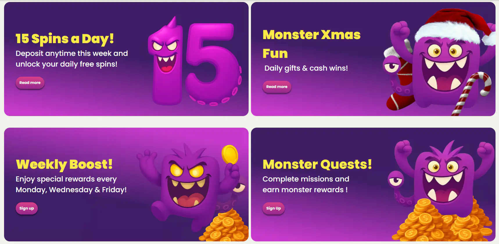 Wij vinden dat elke speler beloond moet worden voor zijn loyaliteit en vertrouwen. Onze specialisten zijn elke dag weer bezig om onze Nederlandse spelers te voorzien van een aantrekkelijk bonusaanbod. Bij casino slotmonster proberen onze specialisten zich vooral te richten op een divers aanbod van bonussen en promoties. Bijvoorbeeld een combinatie van stortbonussen, cashback en toernooi promoties. Na het storten van je speelgeld kun je jouw winsten die jij hebt gewonnen met de bonussen meteen opnemen wanneer jij maar wilt. Hieronder staan enkele van onze bonussen in het overzicht.